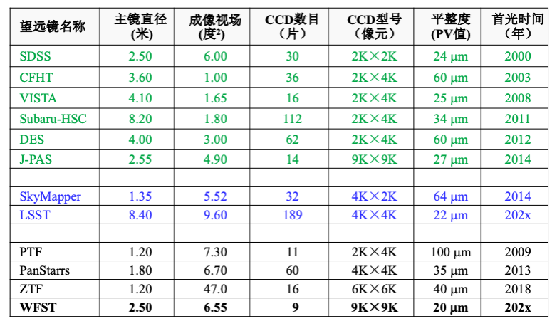 表1 国际大型光学图像巡天项目利用的望远镜和安装的CCD拼接相机参数表