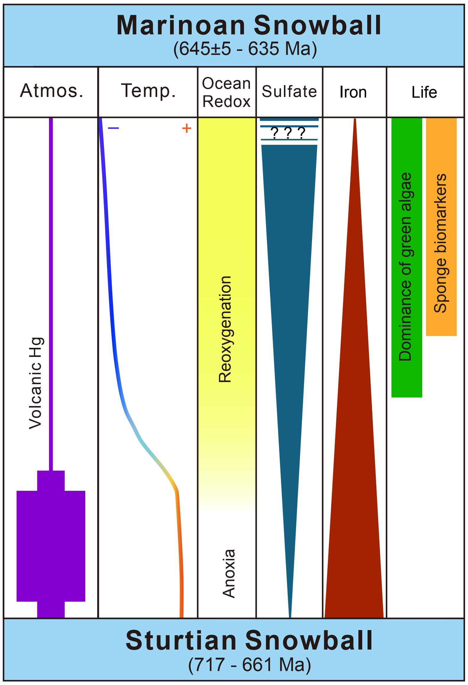 新元古代“雪球地球”事件,分别为斯图特“雪球地球”和马里诺“雪球地球”。前者持续了大约5600万年,后者持续了大约1000万年。在“雪球地球”时期,大气和海洋之间几乎缺乏物质交换,陆地硅酸岩风化作用微乎其微,但持续数百万年的火山活动释放了大量的二氧化碳,形成了超级“温室效应”,从而导致“雪球地球”的迅速消融。在斯图特“雪球地球”消融之后,绿藻开始取代细菌成为主要初级生产者,同时有机生物标记物表明海绵也很可能在冰川消融之后开始出现。因此,探讨“雪球地球”这一极端气候事件与早期复杂生命演化的关系一直是地球科学领域具有挑战性的科学问题。