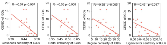 进一步的相关性分析发现,在过度网络游戏使用组中,右侧眶内额上回的枢纽性与过去一年中过度网络游戏程度峰值的量表评分(HEIGD)呈现出正相关关系(如下图所示)。而在网络游戏障碍以及健康对照组中并未发现这种相关性。在过度网络游戏使用组中发现的这种独特的正相关现象可能是一种潜在的保护机制,这种保护机制揭示了为什么同样长期参与网络游戏,过度网络游戏使用组却比网络游戏障碍患者在右侧眶内额上回表现出更高的节点枢纽性。网络游戏障碍患者在决策过程当中表现出更高的决策冲动性,而且其决策冲动性与右侧眶内额上回的节点枢纽性表现出负相关关系,即更低的右侧眶内额上回的枢纽性伴随着更高的决策冲动性。