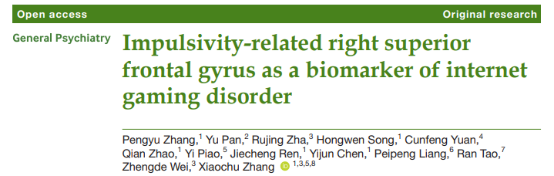 近日,中国科大心理学系张效初团队在General Psychiatry杂志上发表了题为《Impulsivity-related right superior frontal gyrus as a biomarker of internet gaming disorder》的研究论文,探讨了静息态脑网络的节点枢纽性与网络游戏障碍易感性间的关系。研究主要发现,在静息状态下的脑功能网络中,与个体的决策冲动性有关的右侧眶内额上回的节点枢纽性可以作为网络游戏障碍的潜在生物标记物。