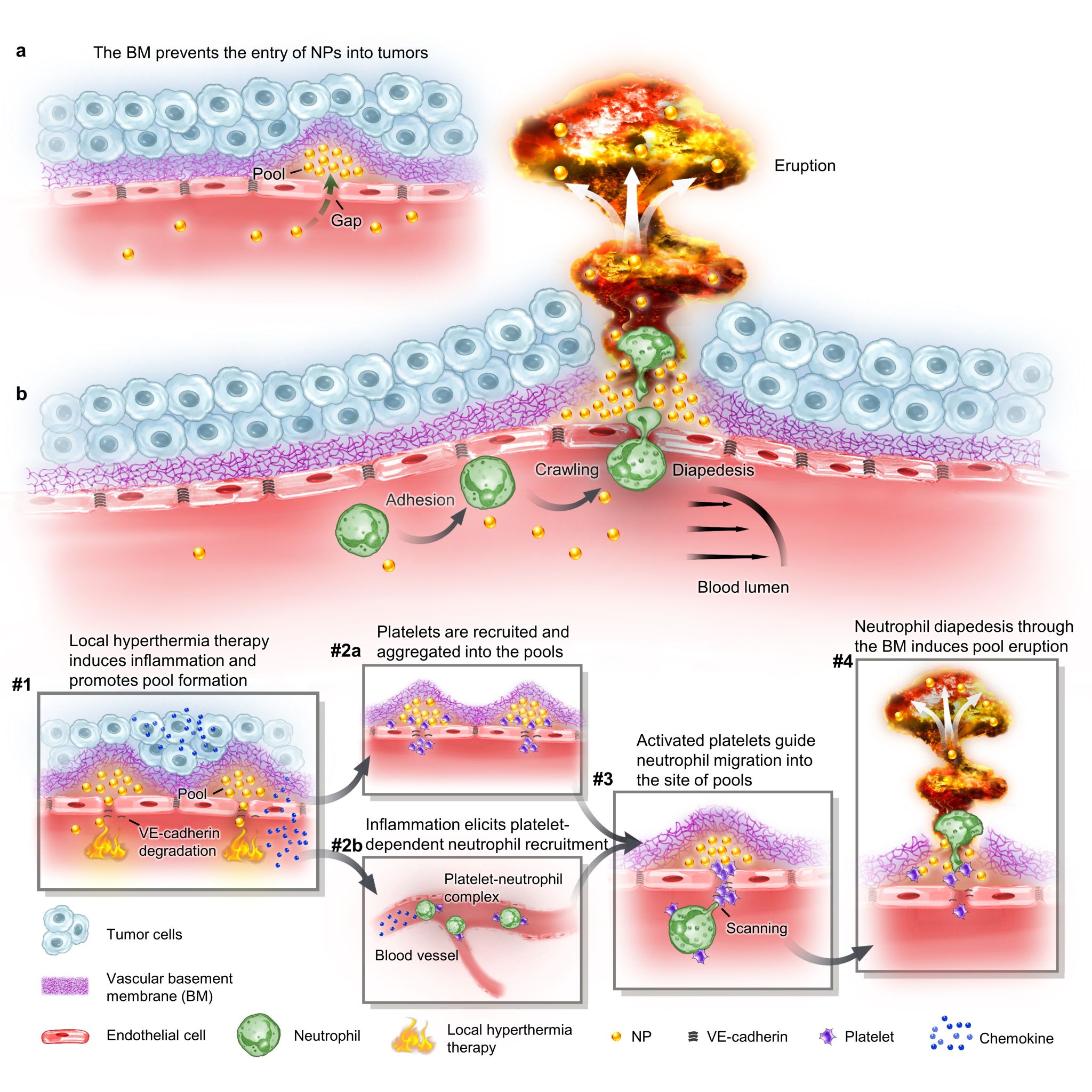 图 基底膜是阻止纳米颗粒进入肿瘤的屏障,通过急性炎症突破基底膜屏障,诱导火山式喷发的示意图。