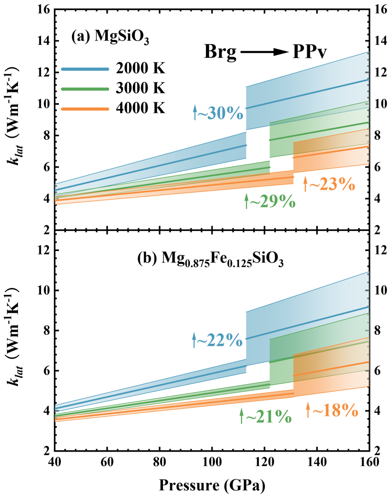 图1. 后钙钛矿相变对Mg(1-x)FexSiO3热导的影响