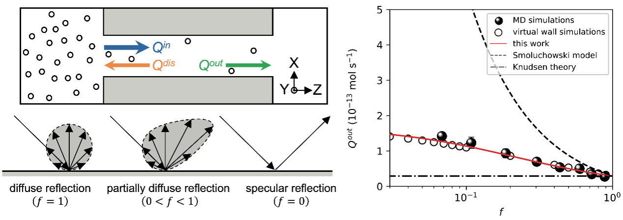 纳米通道中气体输运,不仅在自然界中广泛存在,而且在膜分离、纳米催化、页岩气开采等工业过程中发挥着关键作用。纳米通道气体输运属于自由分子流状态,气体分子与通道壁面的碰撞起主导作用,而气体分子间的相互作用可忽略不计。1909年,丹麦物理学家Martin Knudsen首次提出了描述自由分子流气体流量的理论模型,即Knudsen理论。随后,经过波兰物理学家Marian Smoluchowski和荷兰物理学家Pieter Clausing等人的发展和完善,Knudsen理论成为定量描述自由分子流的核心理论。Knudsen理论的推导基于一个关键假设:气体分子在通道壁面上发生漫反射。然而,随着新材料的出现和观测技术的进步,实验研究发现在某些特定壁面上,尤其是原子级的光滑材料表面,气体分子更倾向于发生镜面反射。这种镜面反射现象导致通过纳米通道的气体流量显著高于Knudsen理论预测值。Smoluchowski给出的修正模型虽然试图调和不同粗糙度的固体壁面,但在对于石墨烯等原子级光滑壁面,其预测结果会发散至无穷大,与实际严重不符。因此,重新修正Knudsen理论以适用于更广泛的通道壁面,尤其是准确定量描述原子级光滑壁面通道内的气体流量,至关重要。