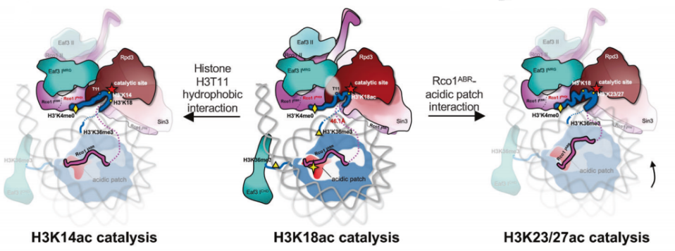 Rco1 N端的ABR结构域通过R61和K64残基直接锚定在组蛋白的酸性斑块的表面,并通过R50和R51残基在SHL-6.5处与nucleosomeDNA结合。此外,Rco1 PHD1结构域的D261侧链直接与H3K4me0相互作用、参与底物的识别;而Rco1 PHD2结构域与Rpd3相互作用参与复合物整体结构的组装和稳定。