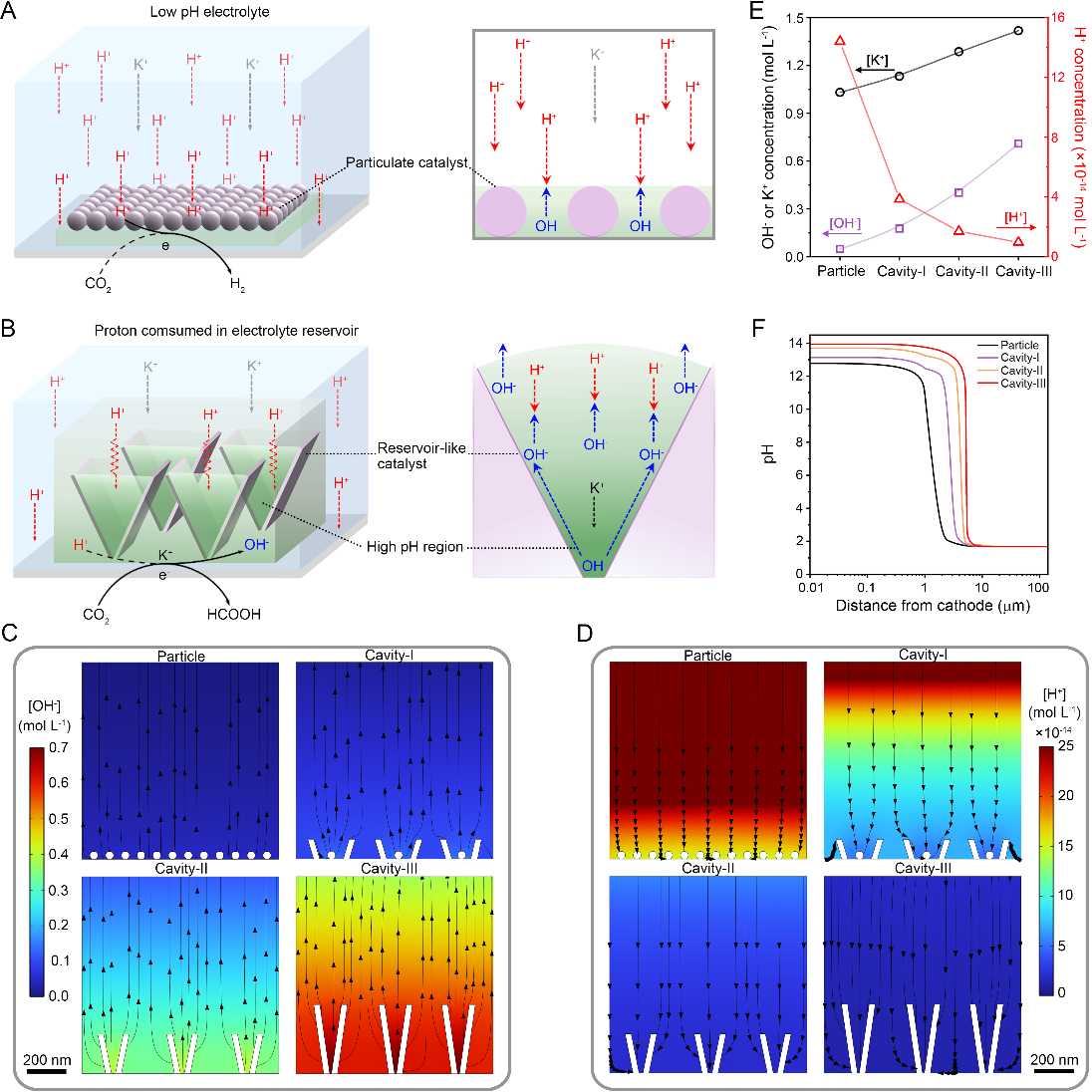 研究人员首先模拟催化剂表面物种分布和pH值情况,发现“储液池”结构能有效富集羟基和钾离子,使电极表面呈局域碱性。相反,颗粒状催化剂表面的羟基和钾离子浓度偏低,导致局域pH较低,不利于CO2R(图1)。