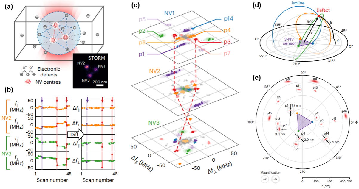 金刚石是一种性能优异的宽禁带半导体材料,材料中点缺陷的电荷动力学会带来随机的电场噪声。本工作中,利用金刚石氮-空位色心激发态的直流斯塔克效应来实现对电场的传感。当某个点缺陷的电荷状态发生改变时,三个氮-空位色心可以同时探测到因电荷变化而引起的电场变化。利用三个色心间电场同时变化的关联特征,可以从杂乱无章的涨落电场中解析出每个点缺陷对应的电场。并且由于每个点缺陷和三个氮-空位色心的相对空间位置不同,就可以根据每个氮-空位色心所感受到的电场方向和大小的不同,来精确定位出点缺陷的空间位置。使用这种类似于卫星定位的量子定位技术,研究团队成功对微米范围内16个点缺陷进行了定位,定位精度最高达到1.7纳米。基于这种关联分辨和精确定位的能力,研究团队还实现了对每个点缺陷电荷动力学的原位实时探测,为研究体材料内部点缺陷的性质提供了新的方法。
