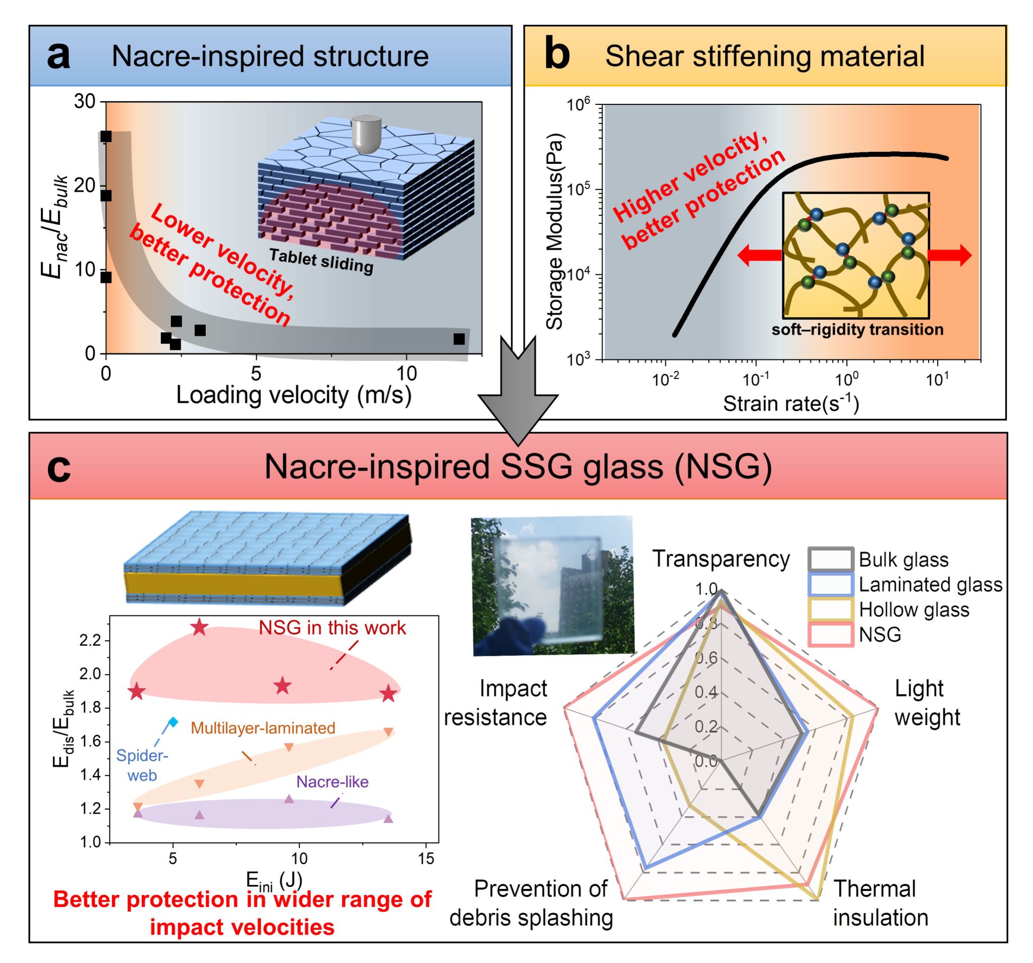 近日,中国科大倪勇教授、何陵辉教授研究团队结合仿贝壳珍珠层结构和剪切变硬智能材料,提出了一种综合应用性能提升的仿生复合玻璃材料。这种复合玻璃材料在保持透明度的同时,还表现出不俗的隔热性能和抗冲击性能。相关研究成果以“Simultaneous Enhancement of Thermal Insulation and Impact Resistance in Transparent Bulk Composites”为题发表于国际期刊《Advanced Materials》。