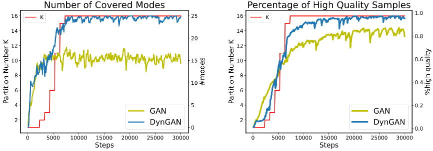 为了解决模式崩溃问题,我们提出了一个统一的框架,称为动态生成对抗网络(Dynamic GAN,DynGAN)。该方法通过对可观察的判别器输出设置相应阈值,检测出生成器无法生成的样本(崩溃样本),根据这些崩溃样本划分训练集,然后在这些划分上训练动态条件的生成模型。