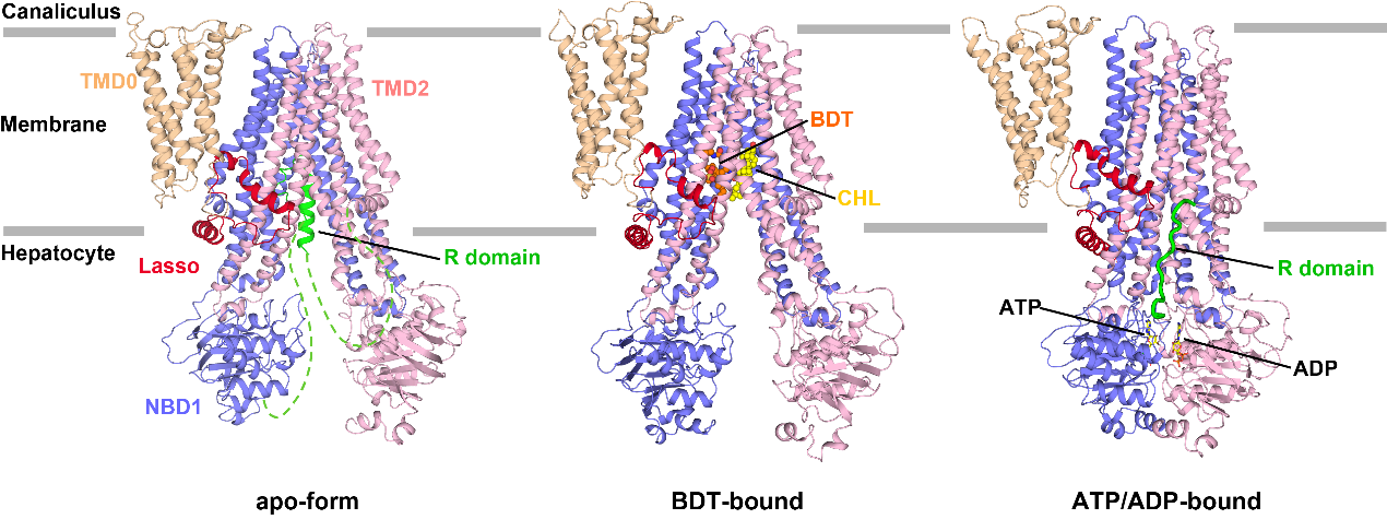 结构分析表明,apo-form ABCC2结构呈现向细胞质基质开口(inward-facing)的构象,两个核苷酸结合结构域(NBD)彼此分开。连接NBD1与跨膜结构域TMD2的调控结构域(R-domain)折叠成发夹结构,并结合到底物转运口袋中,阻止底物的结合,将蛋白质锁定在非活性构象。一旦结合生理底物类似物--二牛磺酸胆红素(BDT),ABCC2仍然处于inward-facing构象,但是R结构域从底物结合口袋中释放。基于结构和生化分析结果,我们推测R结构域作为竞争性亲和力过滤器,阻止某些低亲和力底物的结合,以确保高亲和力缀合胆红素优先向外转运。ATP结合进一步促进ABCC2的构象转变,NBD二聚化后ATP分子被水解,ABCC2转变为封闭构象,底物释放到胆小管中。在这种构象中,R结构域与跨膜螺旋TM14和TM15结合,使ABCC2稳定在这种ATP/ADP结合的活性转换中间态,确保底物的有效转运(图2)。基于上述研究,可以清晰解释R1150H突变体因为减弱了R结构域与TMD2的结合,使得ABCC2的转运活性受损,因此导致临床疾病。该研究不仅描绘了ABCC2在R结构域精细调控下的分子模型和底物转运机制,还为ABCC2功能异常导致的杜宾-约翰逊综合征提供了分子病理学依据。