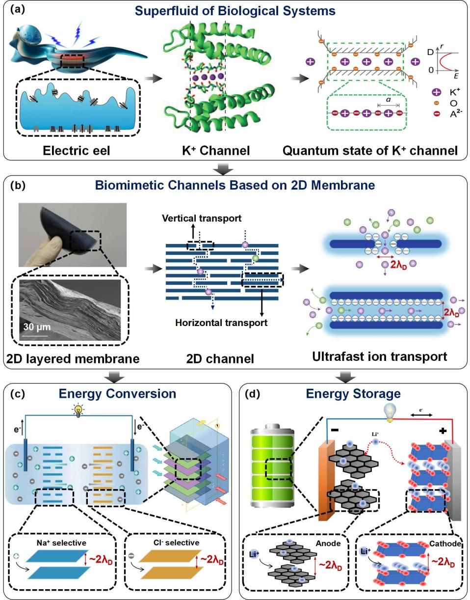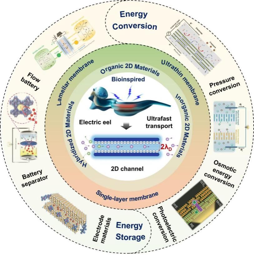 图:用于能源应用的生物启发二维纳米流体膜。(a) 电鳗器官和离子在生物纳米通道中的超快传输。(b) 生物启发二维膜和相应的离子传输过程。(c-d)生物启发二维膜在能量转换和存储中的应用。