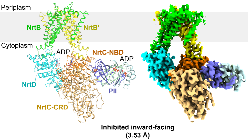碳氮代谢平衡是细胞正常生长和处于稳态的前提。蓝细菌作为一种古老的光合自养型原核生物,进化出由多种转录因子和信号蛋白调控的碳氮代谢网络。其中,作为目前分布最广泛的蛋白家族之一,信号转导蛋白PII响应细胞内代谢小分子和能量的变化,进而调控多种靶蛋白的活性,维持碳氮平衡。在铵盐缺乏的情况下,蓝细菌通过激活硝酸盐同化通路将硝酸盐/亚硝酸盐转运到细胞内并还原为铵,从而为其生长提供氮源。研究表明,PII能与硝酸盐/亚硝酸盐转运蛋白NRT互作进而调控硝酸盐同化通路的活性。NRT由5个蛋白亚基组成:一个底物结合蛋白(SBP)NrtA、两个相同的跨膜亚基(TMD)NrtB以及两个不同的核苷酸结合亚基(NBD)NrtC和NrtD,属于ABC转运蛋白家族的I型ABC importer。与经典ABC转运蛋白不同,其NrtC亚基的C端融合了一个与NrtA相似的调控结构域(CRD),被认为可能参与调控NRT的活性。目前,关于这种新型ABC转运蛋白的结构和转运机理,以及PII如何识别NRT进而调控蓝细菌碳氮平衡的分子机理仍不清楚。