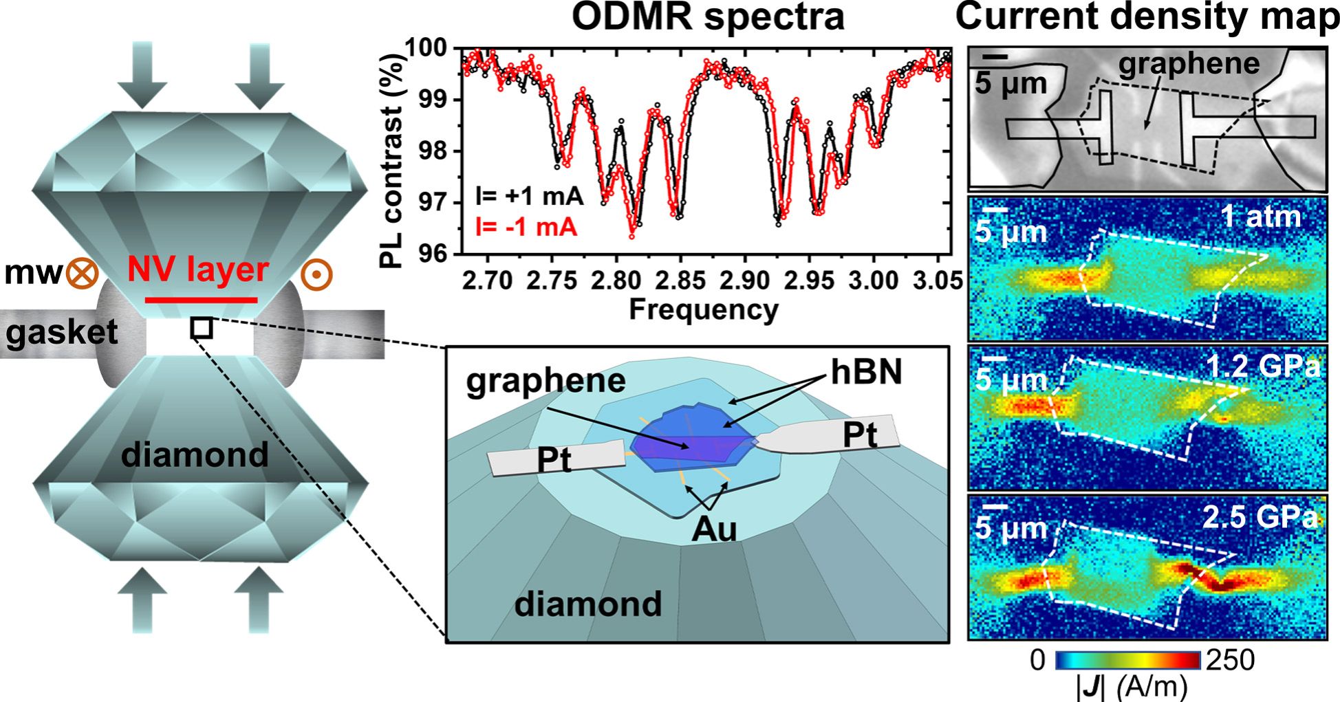 中国科学技术大学张增明教授团队将NV色心与金刚石对顶砧装置(DAC)相结合,展示了二维石墨烯器件中电流密度的无损、高分辨率二维成像及其在高压下的演化,为研究高压下二维材料和电子器件中的电子输运和电导变化以及半导体电路的无损评估开辟了一条重要的新途径。相关成果以“High Spatial Resolution 2D Imaging of Current Density and Pressure for Graphene Devices under High Pressure Using Nitrogen-Vacancy Centers in Diamond”为题于4月15日发表在国际知名期刊Nano Letters上。