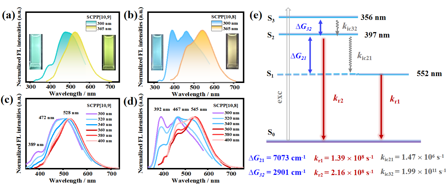 图2.(a-b)异质全苯撑碳纳米双环SCPP[10,9]和SCPP[10,8]在300 nm和365 nm激发下的不同发射; (c-d)SCPP[10,9]和SCPP[10,8]的激发依赖的PL谱;(e)SCPP[10,8]光物理过程的Jablonski图。