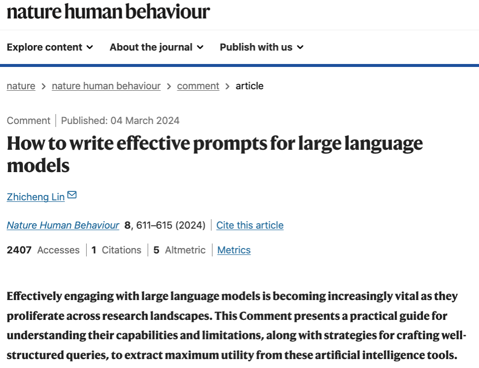 在《自然人类行为》(Nature Human Behaviour)发表的文章中,林志成详细讨论了与大语言模型交互时如何写有效的“指令”(Prompt)。文章强调,精心设计的指令不仅可以提高响应的准确性和相关性,还可以避免由于指令质量不佳而导致的模型表现不佳。