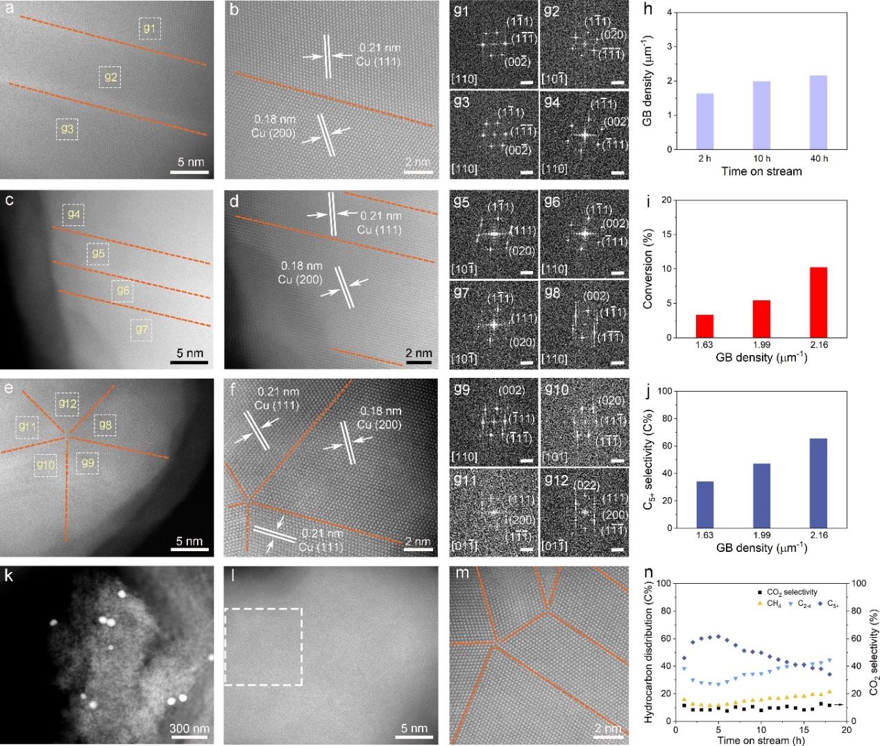 为了研究催化性能存在活化期的原因,研究人员收集了反应不同阶段(图1a中的2小时,10小时和40小时)的样品进行结构演变表征。通过球差电镜发现在合成气氛围下反应2小时后,催化剂通过小颗粒的相互聚集,形成了具有晶界的较大米颗粒(图2a和b)。随着反应时间的延长,颗粒逐渐变大,晶界位点也逐渐增多(图2c-f)。借助快速傅里叶变换(FFT) 图像发现界面处存在不同晶面(图2g1-g12)。通过统计计算,研究人员发现晶界密度和C5+选择性呈正相关(图 2h-j)。为了排除分子筛的影响,确认晶界的C-C偶联作用,研究人员将可控合成得到的Cu纳米颗粒负载到惰性SiO2载体上,同样发现具有较高的C5+选择性(图2n)。以上结果表明Cu晶界位点在C-C偶联中具有的决定性作用。