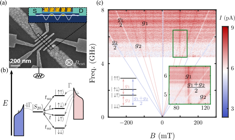 图1. (a) 双量子点结构扫描电子显微镜图片,横截面示意图在插图中展示。(b) 双量子点系统中单重态和三重态能级以及输运电流形成示意图。(c) 纵向驱动下输运电流随着外磁场B与驱动频率的关系。从测量结果中可以明显地观察到多组共振谱线,这样的奇偶效应是纵向耦合带来调制效应的直接证据。