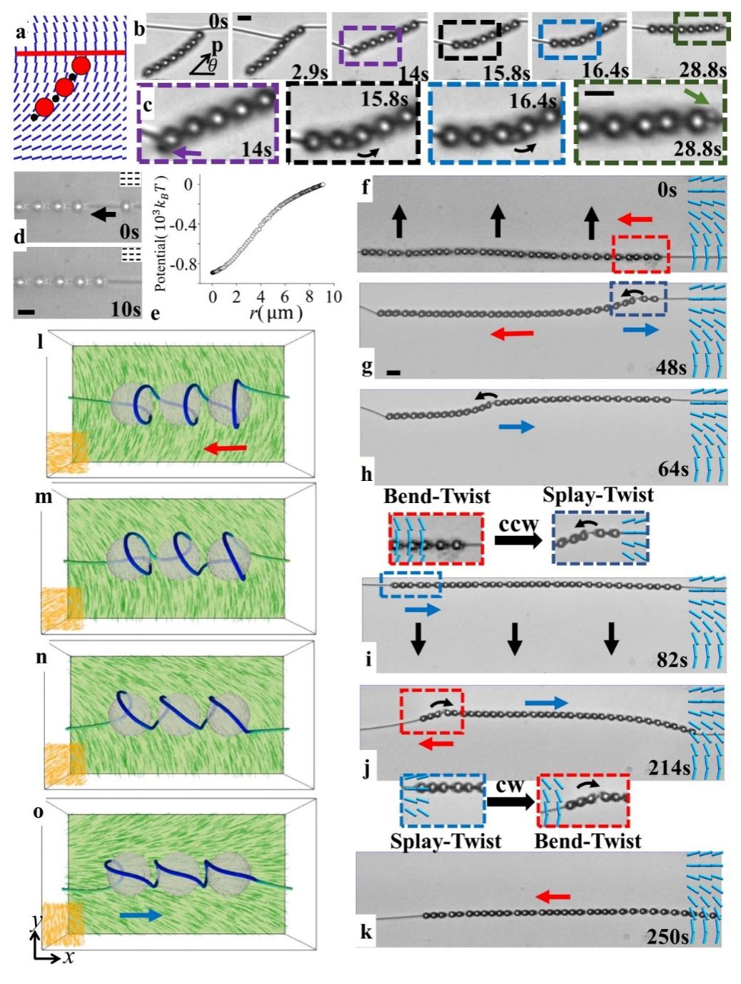 因此,研究团队通过在向列相液晶中引入两种不兼容的拓扑模式,制备了胶体纠缠结构。胶体纠缠的形成机制源于向错线拓扑结构与胶体拓扑结构的耦合。在没有外部刺激的情况下,非手性向列相液晶中可随机产生左手和右手两种不同手性的胶体纠缠结构。然而,向错线在光驱动至非平衡状态时,胶体纠缠结构的重构得以实现。具体来说,由于向错线中拓扑结构的转变,诱导胶体纠缠结构手性的可控转换。研究团队通过操纵位错线的拓扑模式和几何形状,还实现了胶体纠缠的合并和分裂等多种集体行为。手性转换表现为胶体自组装的集体旋转的“多米诺效应”,如图所示。此外,通过控制向错线网络的时空演化,还实现了一种复杂的胶体纠缠双螺旋结构。