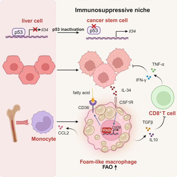 抑癌基因TP53(编码p53蛋白)通常发挥肿瘤监查功能,TP53基因突变后转变为癌基因,是多种肿瘤发生发展的驱动因素。中国科学技术大学生命科学与医学部免疫调节与免疫治疗重点实验室魏海明教授课题组发现,p53可以直接调控免疫细胞的发育、分化与功能,在肿瘤免疫微环境中发挥重要作用。p53突变导致肿瘤干细胞分泌白细胞介素34(IL-34),IL-34代谢重编程肿瘤相关巨噬细胞,进而抑制CD8T细胞的抗肿瘤免疫。研究成果于2024年9月24日以“Interleukin-34-orchestrated tumor-associated macrophage reprogramming is required for tumor immune escape driven by p53 inactivation”为题,在线发表于Immunity杂志。本研究揭示了p53调控肿瘤免疫微环境的关键机制,并为p53突变的肝癌提供了精准免疫治疗的潜在靶点。
