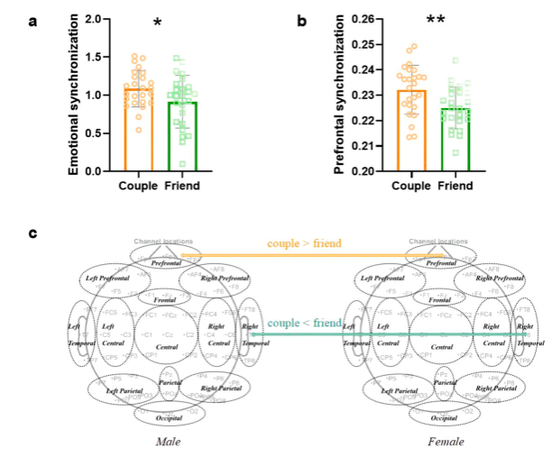 研究团队通过EEG超扫描技术,对26对情侣和25对密友在观看情感视频时的神经活动进行了同步记录。结果显示,情侣在情感同步方面显著高于密友,特别是在前额叶皮层(PFC)的神经同步上表现更为显著。进一步分析发现,情侣之间的情感同步程度与其关系质量呈正相关,而神经同步则与关系质量呈负相关。这表明,高质量的浪漫关系促进了情感同步,而神经同步可能作为情感同步的补偿机制,在关系质量下降时发挥作用。