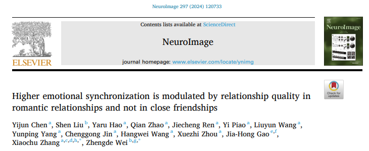 7月20日,神经影像学权威期刊NeuroImage在线发表了中国科学技术大学心理学系韦正德特任副研究员和张效初教授合作的题为“Higher emotional synchronization is modulated by relationship quality in romantic relationships and not in close friendships”的文章。该研究揭示了浪漫关系质量与情感同步之间的神经机制联系,为情感神经科学领域提供了新的视角和思路。