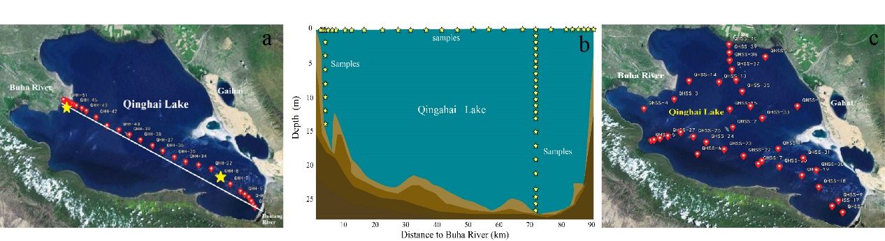图1.(a)青海湖水样横向剖面采样点(b)青海湖水样垂直剖面的采样点(c)青海湖沉积物采样点
