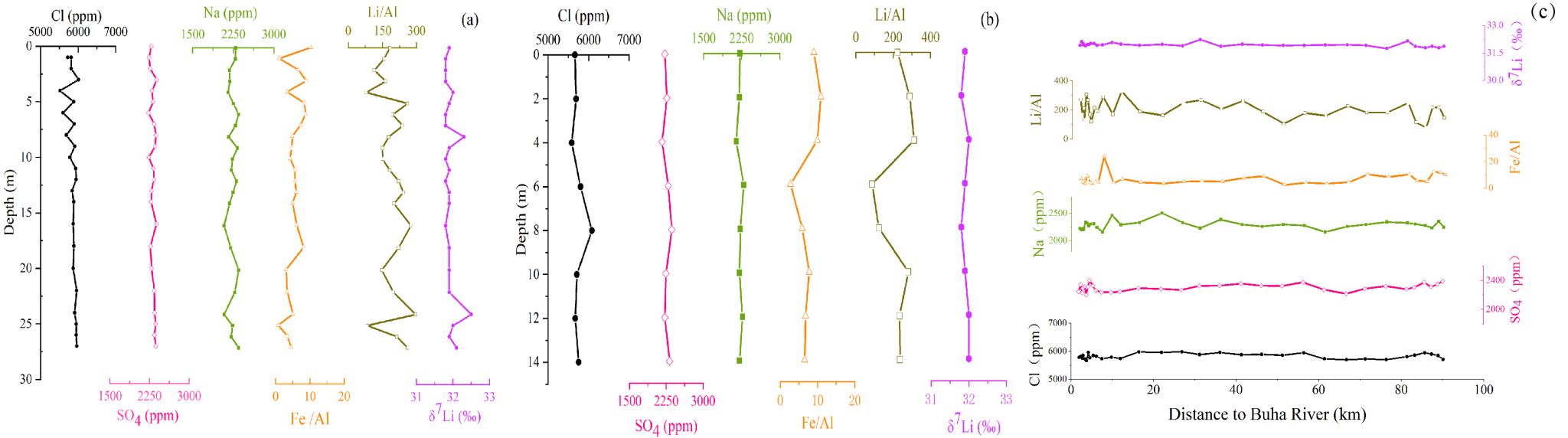 图2.(a)(b)分别是青海湖的两个垂直断面湖水元素浓度,前者水深27m,后者水深14m(c)是青海湖横向剖面湖水元素浓度