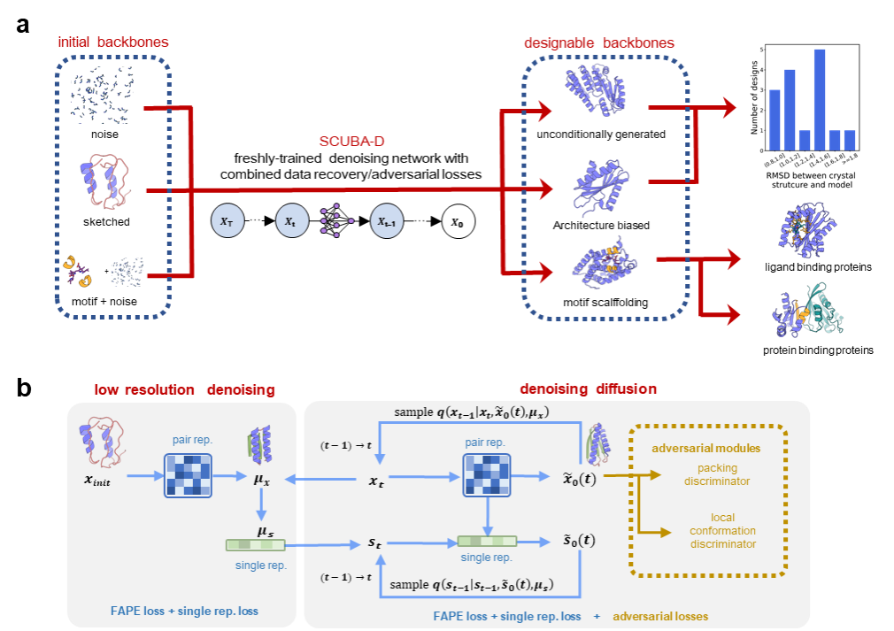 刘海燕教授、陈泉教授团队长期致力于发展数据驱动的蛋白质设计方法。在前期工作中,建立并实验验证了利用神经网络能量函数从头设计主链结构的SCUBA模型(Nature2022),本文报道的SCUBA-D(SCUBA-diffusion)模型,是基于深度学习的主链设计算法的迭代升级。SCUBA-D能够基于不同输入执行多类蛋白质结构设计任务(图a)。在模型设计上,通过在扩散模型训练中引入对抗损失(adversarial loss)(图b),避免生成模型产生物理上不可行的结构,实现了高成功率的主链结构设计。由于没有使用已有结构预测网络作为预训练降噪网络,SCUBA-D能够在设计中避免对已知天然结构的过度偏好,可发现已有模型在可设计蛋白质结构空间中的盲区。
