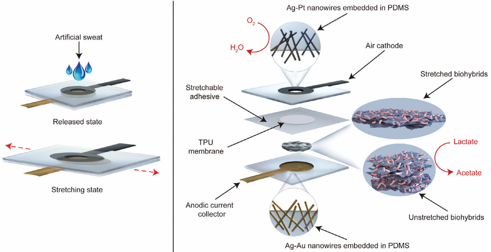 可穿戴自供能技术是维持人体和软体机器人可穿戴电子设备长期运行的关键。微生物燃料电池可以利用微生物将汗液中的化学能(如乳酸,葡萄糖、尿毒等)转化为电能,被认为是一种自然且有效的潜在自供能技术。生物燃料电池的可拉伸性是其在动态力学环境下运行的关键。然而,实现可拉伸微生物燃料电池十分困难。其难点在于微生物燃料电池各个组件(阳极、阴极、离子交换膜、细菌催化剂和封装层)在拉伸状态下无法同步地保持其原有功能。
