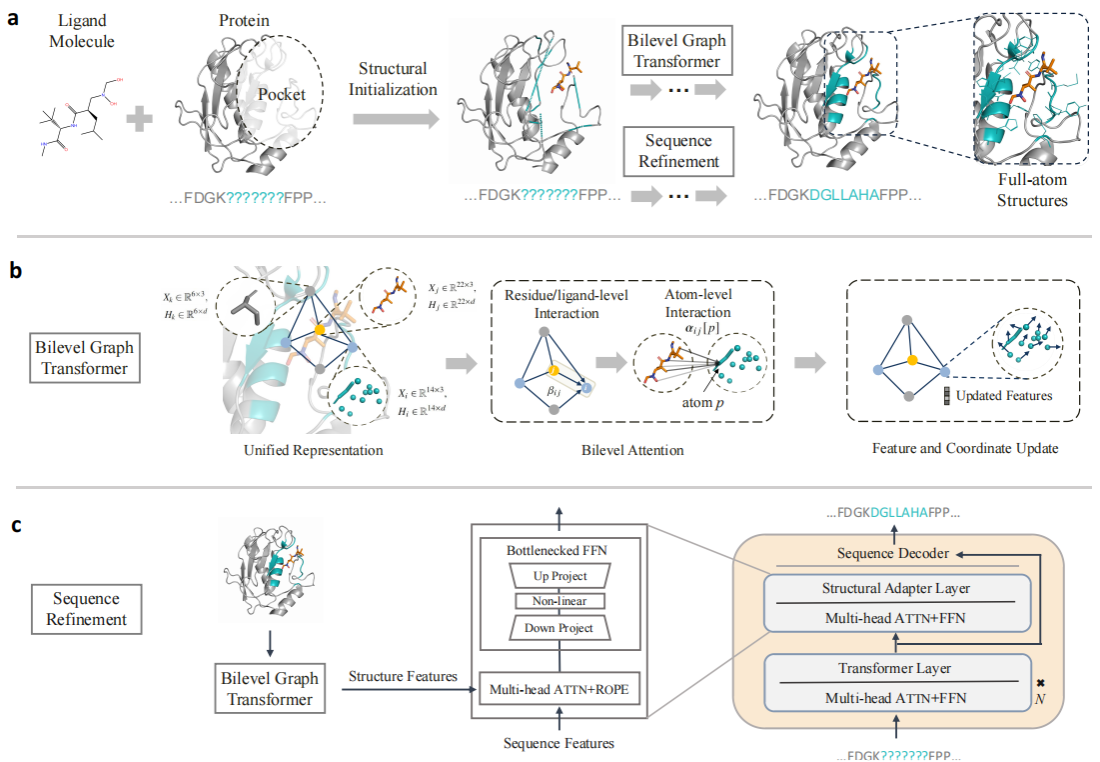 图1. (a) 用PocketGen进行蛋白质序列-结构共同设计。(b) 双层图Transformer编码器;(c) 蛋白质预训练语言模型用于序列预测及高效微调技术。