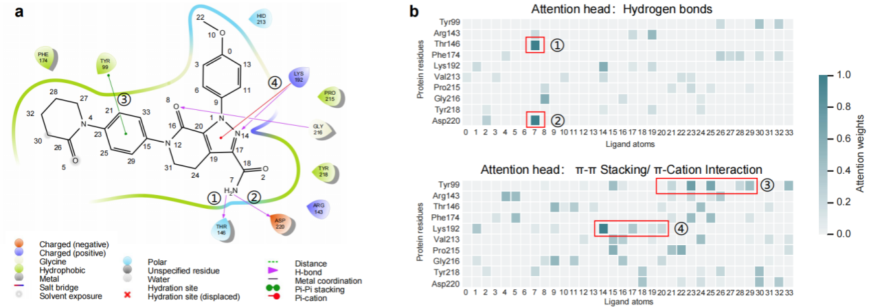 图2. 左侧图为薛定谔软件分析的蛋白质-小分子相互作用关系图。在右侧展示的是PocketGen两个注意力矩阵头的热图,与左侧相互关系成功对应上。