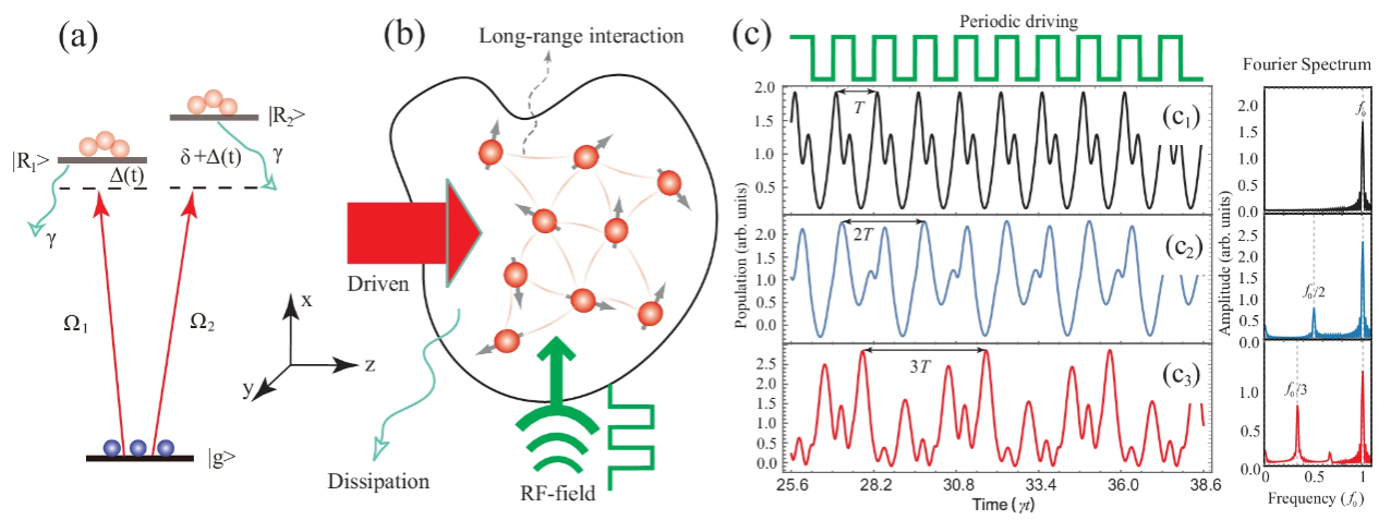 图 1 物理示意图,(a)为包含两个里德堡态的系统能级图,(b)为驱动耗散的系统示意图,(c)为系统在周期为T的射频驱动下的响应。对于一般的系统来说,系统响应的周期往往和驱动周期保持一致,但是当系统处于离散时间晶体相时,系统的响应周期表现为驱动周期的整数倍,如图中的2-DTC,3-DTC。