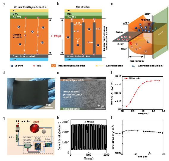 传统层状结构探测器示意图(a)、体相肖特基结探测器结构示意图(b)、碳电极/钙钛矿界面处的肖特基结示意图(c)、碳电极/钙钛矿复合膜的照片(d)和SEM下的截面形貌(e)、体相肖特基结辐射探测器在不同偏压下的灵敏度(f)、自制的便携式X射线报警装置(g)、脉冲X射线下的工作稳定性(h)、长期储存稳定性(i)。