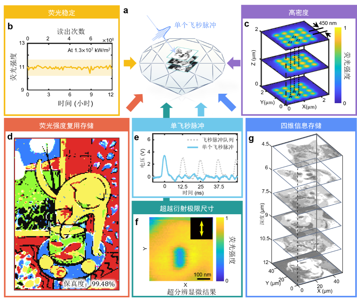 图1:(a)金刚石信息存储概念图;(b)多次读出后荧光信号的稳定性表征;(c)高密度堆叠下信息存储单元扫描成像结果;(d)通过荧光强度复用实现的色彩图案存储;(e)实验使用的单个飞秒脉冲表征;(f)通过超分辨显微镜观察单个荧光存储单元尺寸,存储单元荧光信号为负信号;(g)四维信息存储数据展示。