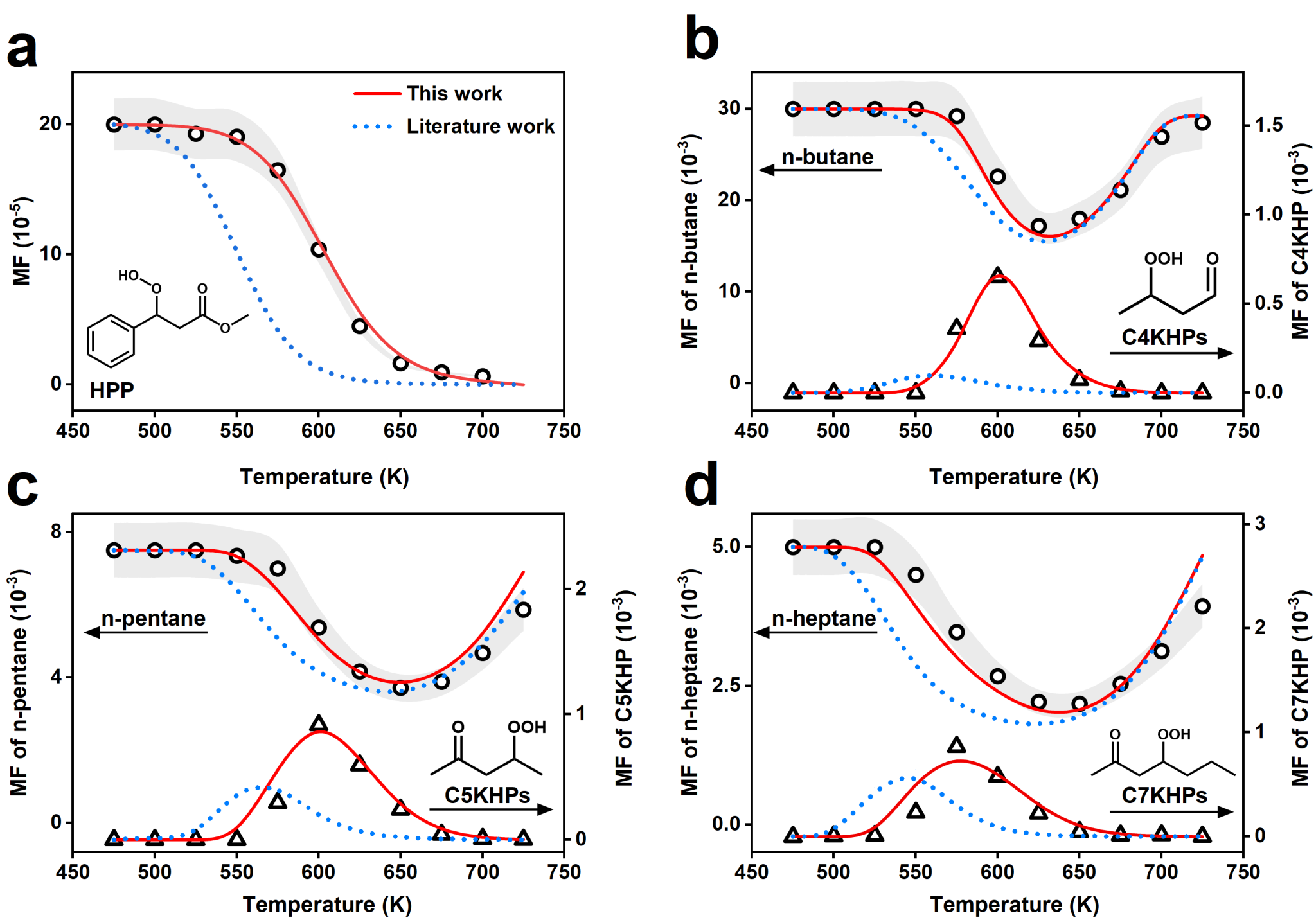 本工作采用新测量的烷基过氧化物和羰基过氧化物的分解速率常数,对燃烧学界最新发展的低温燃烧动力学模型进行了修正。如图2所示,采用新测量的羰基过氧化物分解速率常数,显著地改进了模型的预测精度,为发展更加准确的低温燃烧动力学模型提供了重要的基础燃烧动力学数据。