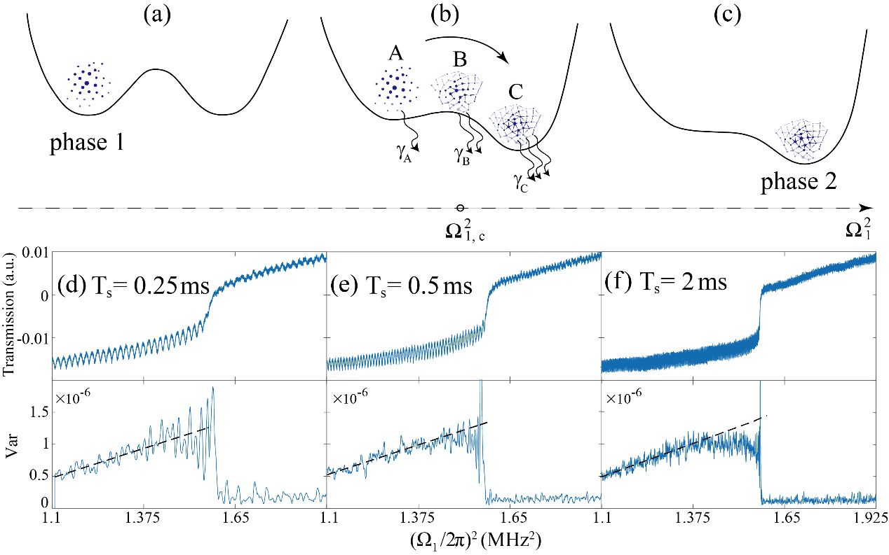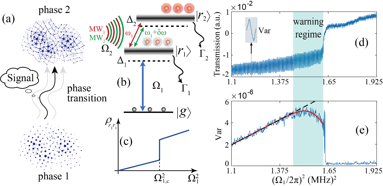 图 1 :物理模型图。(a)为相变示意图。(b)为双音驱动两个里德堡态的能级示意图。(c)为里德堡原子系统的相变。(d)为双音微波驱动下的电磁诱导透明(EIT)谱线。(e)是通过计算图d中谱线的方差得到。在系统接近临界点时,方差表现出非线性行为,这一行为可作为临界点前的早期预警信号。