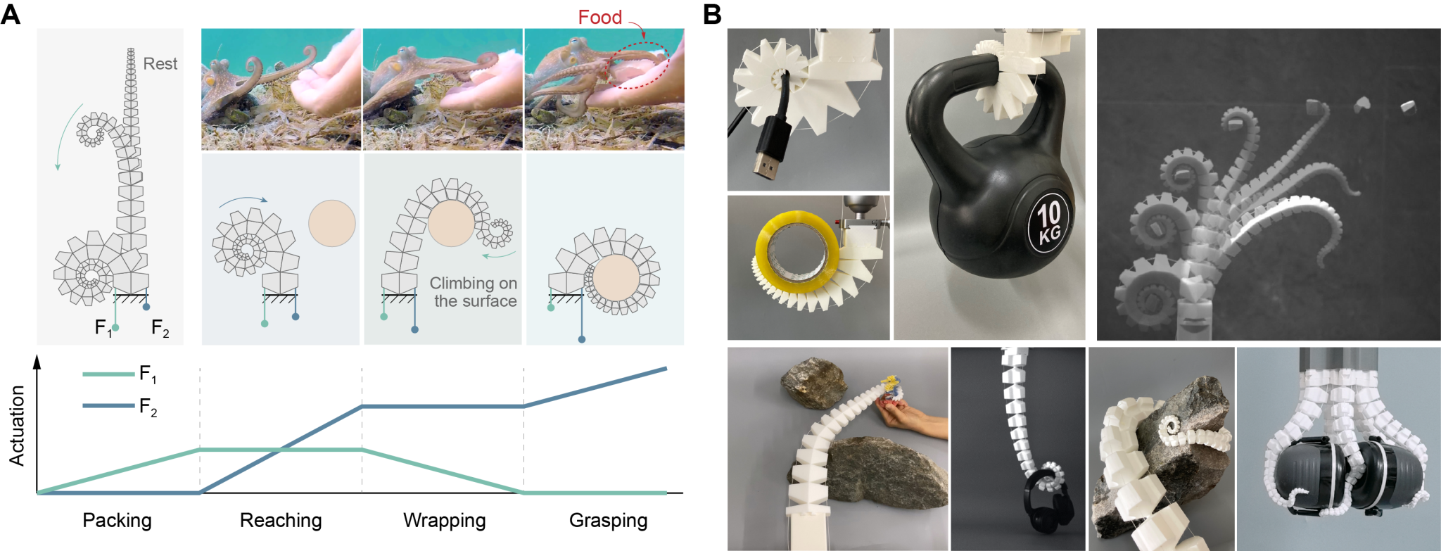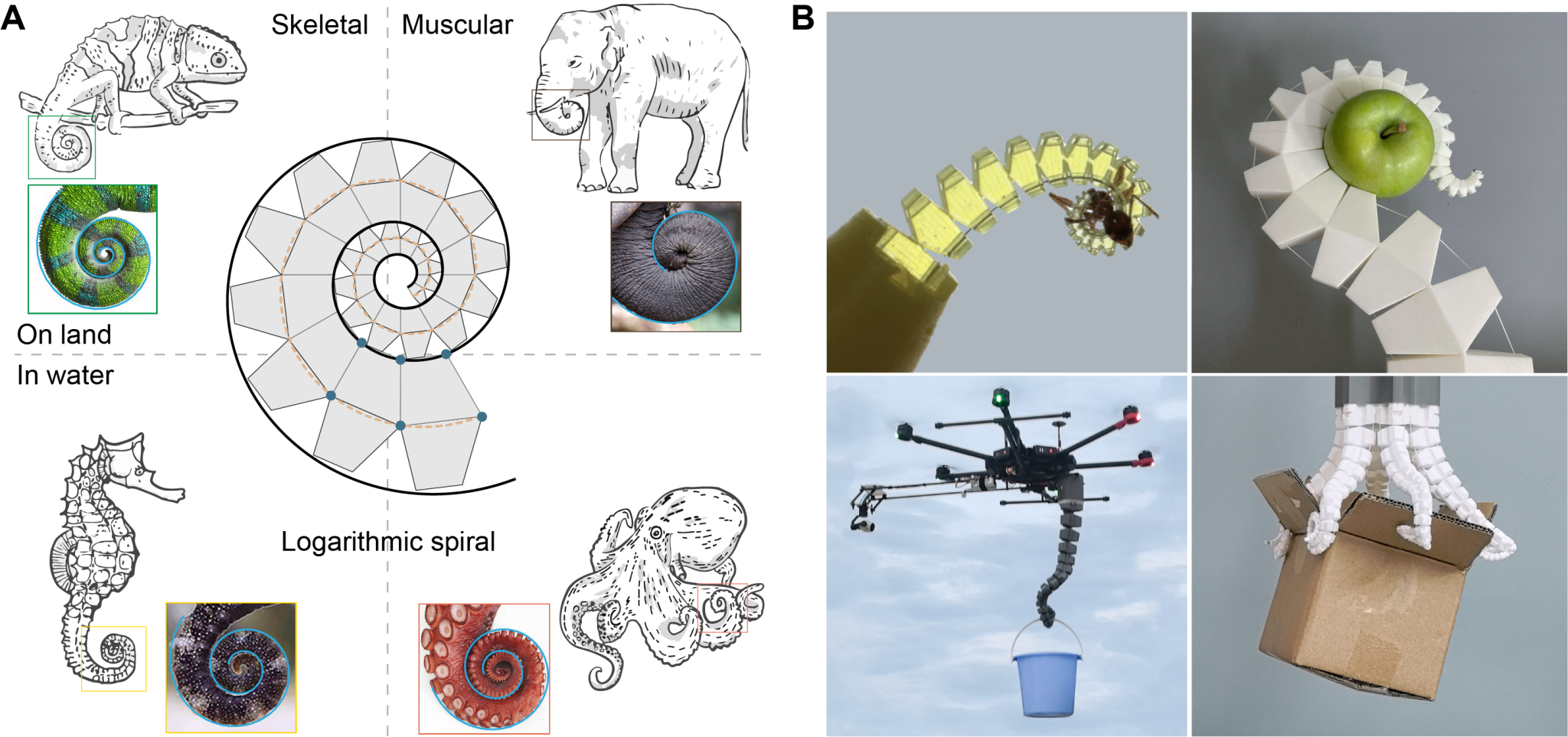 中国科学技术大学Nikolaos Freris特任教授课题组及其合作者魏熹特任副研究员在软体机器人领域取得重要进展。该团队基于对自然界中多种生物柔性肢体(如象鼻、章鱼触手、海马和变色龙尾巴)形态和运动的系统观察和数学模型抽象,首次提出基于对数螺旋线结构的新型螺旋软体机器人,展示了其在多维度和多场景中执行复杂抓取和操作任务的能力。相关研究成果以“SpiRobs: Logarithmic Spiral-shaped Robots for Versatile Grasping Across Scales”为题发表在Cell Press(细胞出版社)旗下期刊Device上。