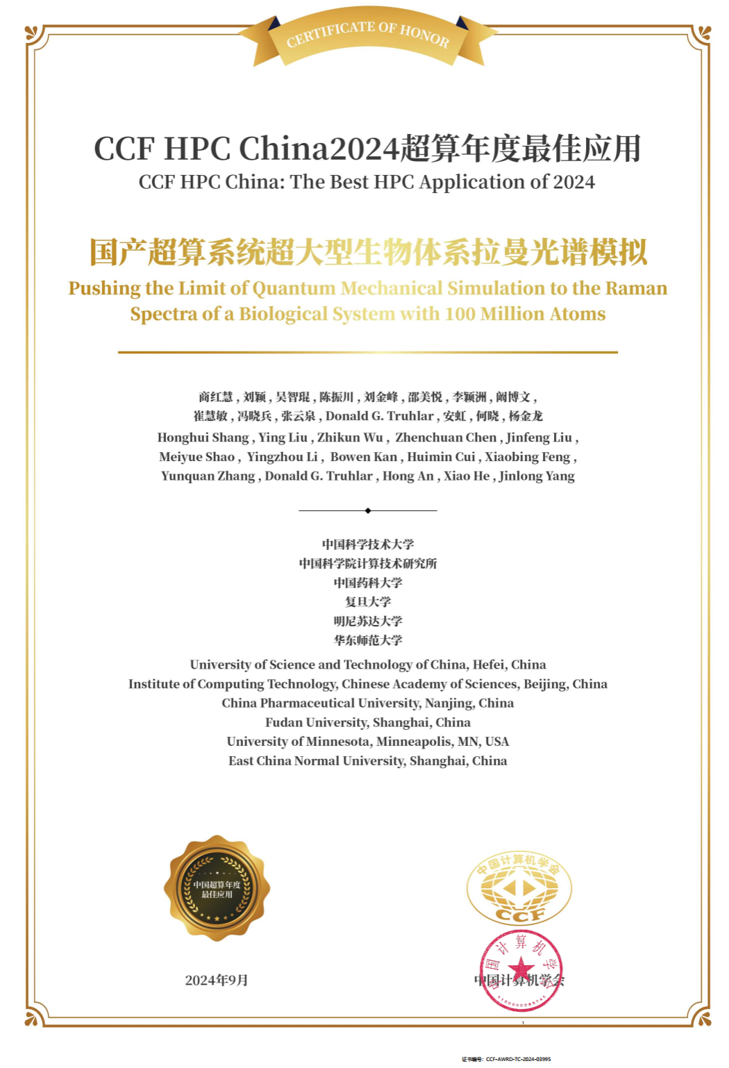 中国科学技术大学精准智能化学重点实验室商红慧教授、杨金龙教授团队与中国科学院计算技术研究所刘颖高级工程师,华东师范大学何晓教授等团队合作完成的研究成果“Pushing the Limit of Quantum Mechanical Simulation to the Raman Spectra of a Biological System with 100 Million Atoms”成功入围2024年戈登·贝尔奖,这是2024年入围该奖的唯一中国团队成果,也是该团队继2021年后再次入围该奖项。戈登·贝尔奖是国际高性能计算应用领域最高奖,由美国计算机协会(ACM)颁发,用于表彰世界范围内高性能计算的杰出成就,尤其是高性能计算应用于科学、工程和大规模数据分析领域的创新工作,被称为“超算领域的诺贝尔奖”。此前,该成果也获得了2024年中国计算机学会(CCF)“中国超算年度最佳应用奖”。