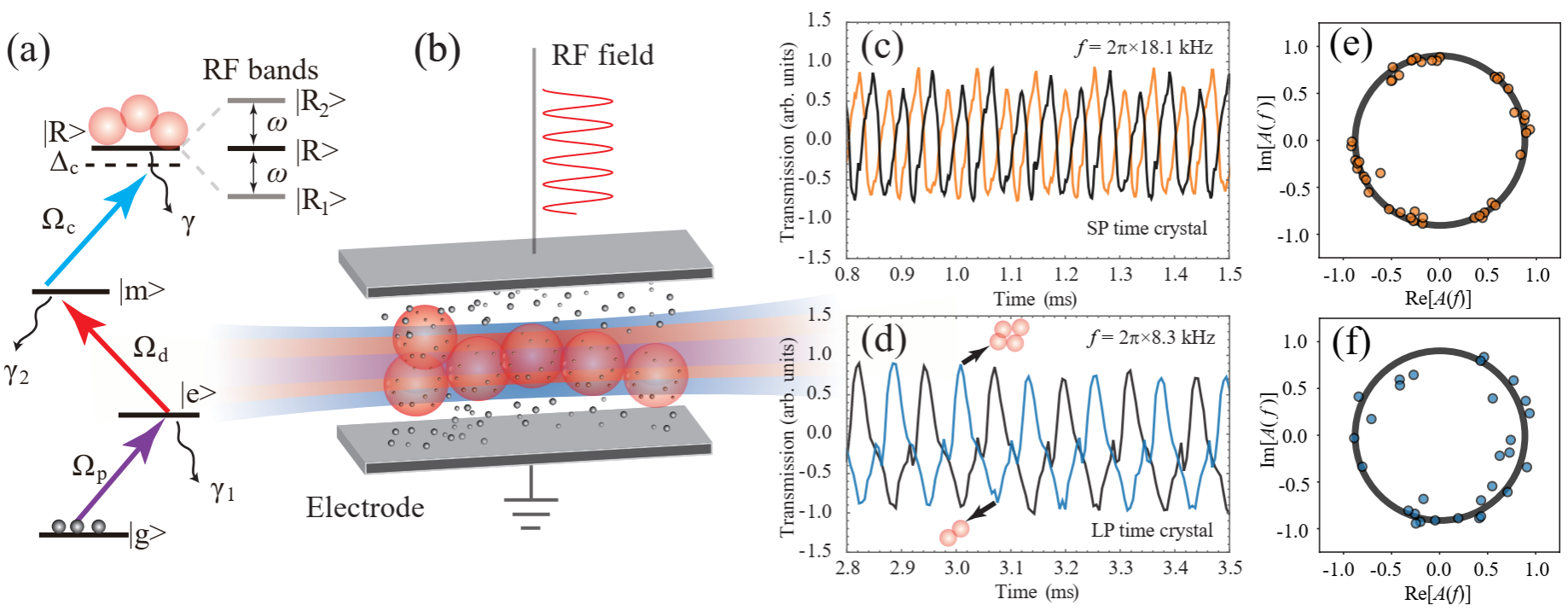 图1 物理示意图,(a)为包含多个里德堡态的系统能级图,(b)为实验系统示意图,(c-f)为系统的时间响应以及对应的傅里叶变化振幅和相位分布。通过调节系统参数,系统响应表现出不同频率的自发振荡。