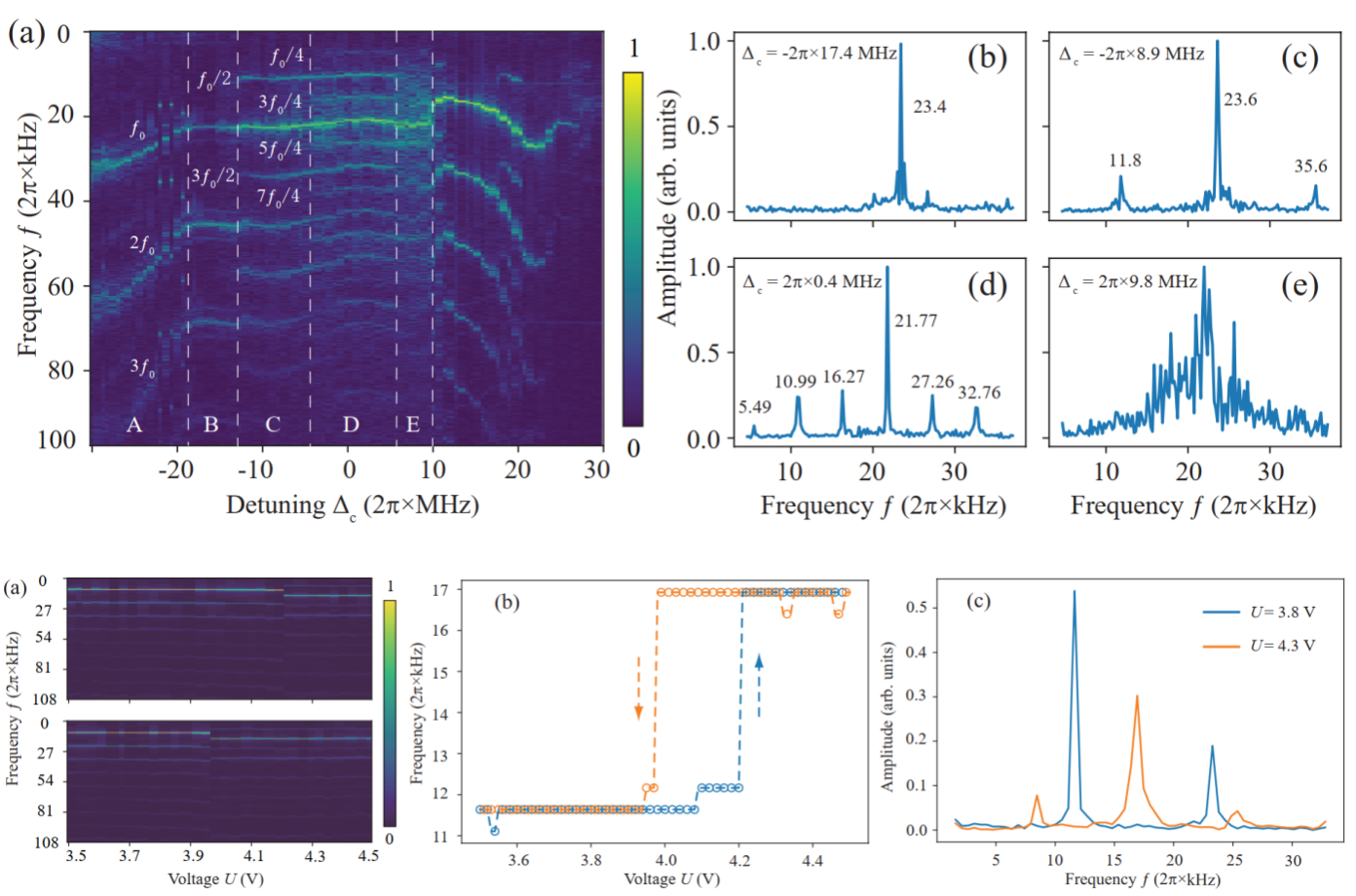 图2 时间晶体的分岔效应,(A)系统响应随着失谐变化的相图,(B-E)时间晶体倍周期分岔直至混沌的相变过程;时间晶体随着电压变化的双稳态现象,(a)时间晶体随电压变化的相图,(b)时间晶体频率随电压的变化关系,(c)不同频率的时间晶体傅里叶频谱。