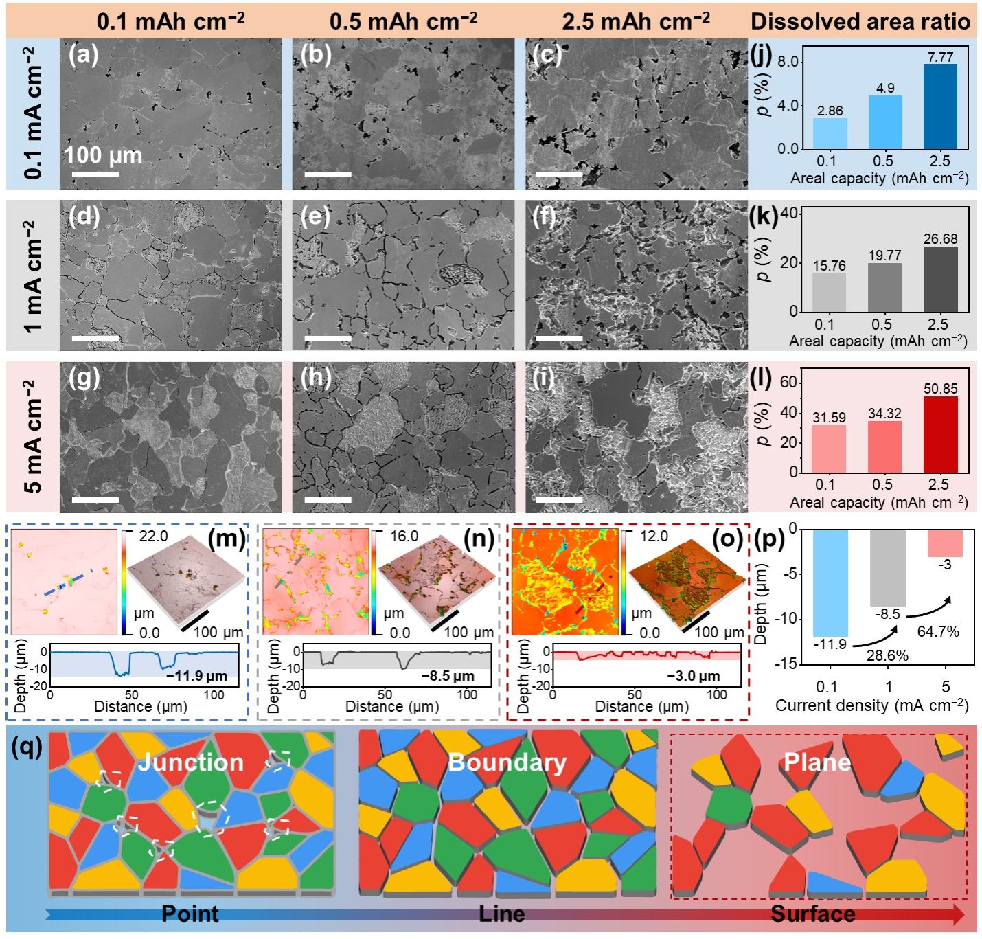 不同于传统AZBs测试中直接采用原始锌箔,本研究基于精细抛光的锌箔以排除表面粗糙度的干扰,并清晰展现晶粒和晶界等微观结构。实验结果表明,随着电流密度的升高,电溶解行为呈现“点-线-面”的行为转变和0D-1D-2D的维度跨越。结合多晶体的电子背散射衍射表征、单晶体的腐蚀电位测试和第一性原理计算,研究团队揭示了锌不同晶面之间的电溶解行为差异,发现(002)晶面最难被剥离,而(110)晶面最容易被破坏。