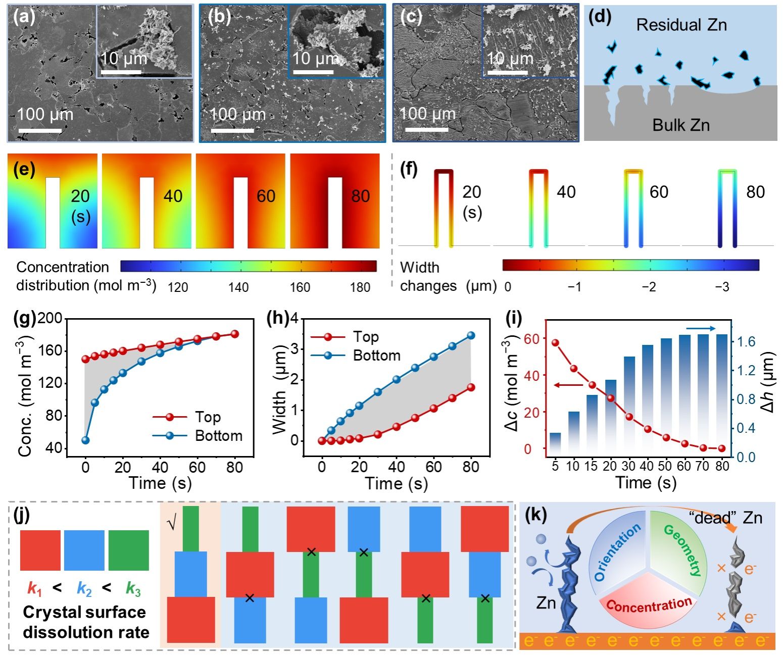 此外,研究团队深入研究了电溶解与锌电极容量不可逆性之间的关系。通过考虑枝晶的外部浓度分布和自身结构异质性阐明了“死锌”形成机制。相对于顶部枝晶,底部枝晶附近由于具有较低的离子浓度表现出较高的溶解速率。此外,枝晶内部不同晶粒的取向差异也会导致局部溶解速率不同,进一步加剧枝晶的不均匀溶解,最终导致枝晶断裂和“死锌”形成。这一发现为抑制“死锌”形成和提高锌电极可逆性提供了理论依据。