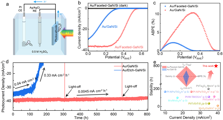 图2.晶圆级新型GaN/Si光电极光电化学制氢活性和稳定性评估