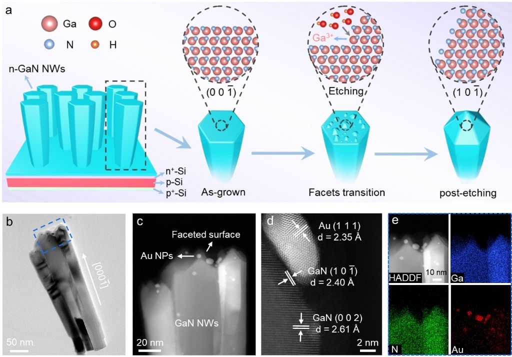 图1.a)晶圆级的氮化镓纳米线/硅太阳能电池光电极结构示意图及氮化镓纳米线的碱性蚀刻晶面重构工艺;b-e)重构氮化镓纳米线(10-1-1)晶面/金纳米颗粒界面的电镜表征
