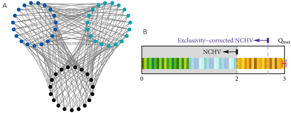 图1:(A) 包含三个条件概率组合的GHZ型悖论中互斥事件的图表示;(B) 实验结果及相应的非互文隐变量模型(NCHV)理论预言结果。