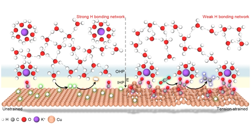 如图1所示,钾离子作为水结构破坏性例子,在界面处富集会降低氢键网络连通性,抑制氢离子向界面扩散,降低析氢反应活性。同时,钾离子的存在有利于关键中间体吸附态一氧化碳(*CO)的吸附,有效降低碳-碳偶联反应的能垒。该工作通过在催化剂表面引入拉伸应变,实现了在低钾离子浓度电解液中对钾离子的富集,抑制了析氢副反应,实现了强酸条件下二氧化碳还原制乙烯的高选择性(图1)。研究人员利用原位拉曼光谱、原位红外光谱对催化剂反应过程中界面环境进行原位测试,有力地证明了上述增强机理。