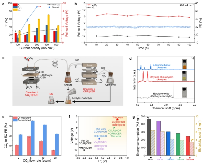 进一步,研究人员设计了新型的质子交换膜测试装置,使用应变铜作为膜电极组件的阴极催化剂,而氢气氧化反应作为阳极反应,实现了在300mA cm-2电流密度下乙烯选择性为44.3%(槽压为3.1V),并稳定运行100小时以上。进一步利用级联反应,最终实现了在全系统电压仅为6.59 V的条件下环氧乙烷法拉第效率达到35.5%。技术经济分析表明,相较于之前的电解系统,本设计能耗最低:生产1公斤环氧乙烷消耗能量仅245.5兆焦,电费约为3.4美元(图2)。