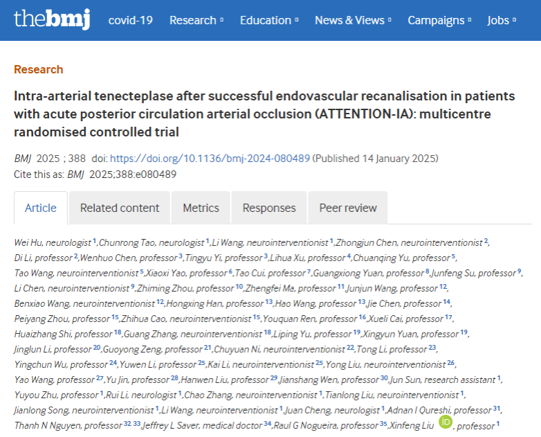 北京时间1月14日,中国科大附一院(安徽省立医院)神经内科胡伟、刘新峰教授团队在国际顶级医学期刊《英国医学杂志》(The British Medical Journal,BMJ)上发表题为“Intra-arterial tenecteplase after successful endovascular recanalisation in patients with acute posterior circulation arterial occlusion (ATTENTION-IA): multicentre randomised controlled trial(急性后循环动脉闭塞脑卒中患者进行血管内治疗血管再通后给予替奈普酶动脉溶栓治疗)”的研究论文(以下称为ATTENTION IA研究)。这也是继2022年在《新英格兰医学杂志》(NEJM)发表脑卒中ATTENTION研究成果后,胡伟、刘新峰教授团队再次在国际顶级医学期刊上发表脑卒中相关临床研究成果。