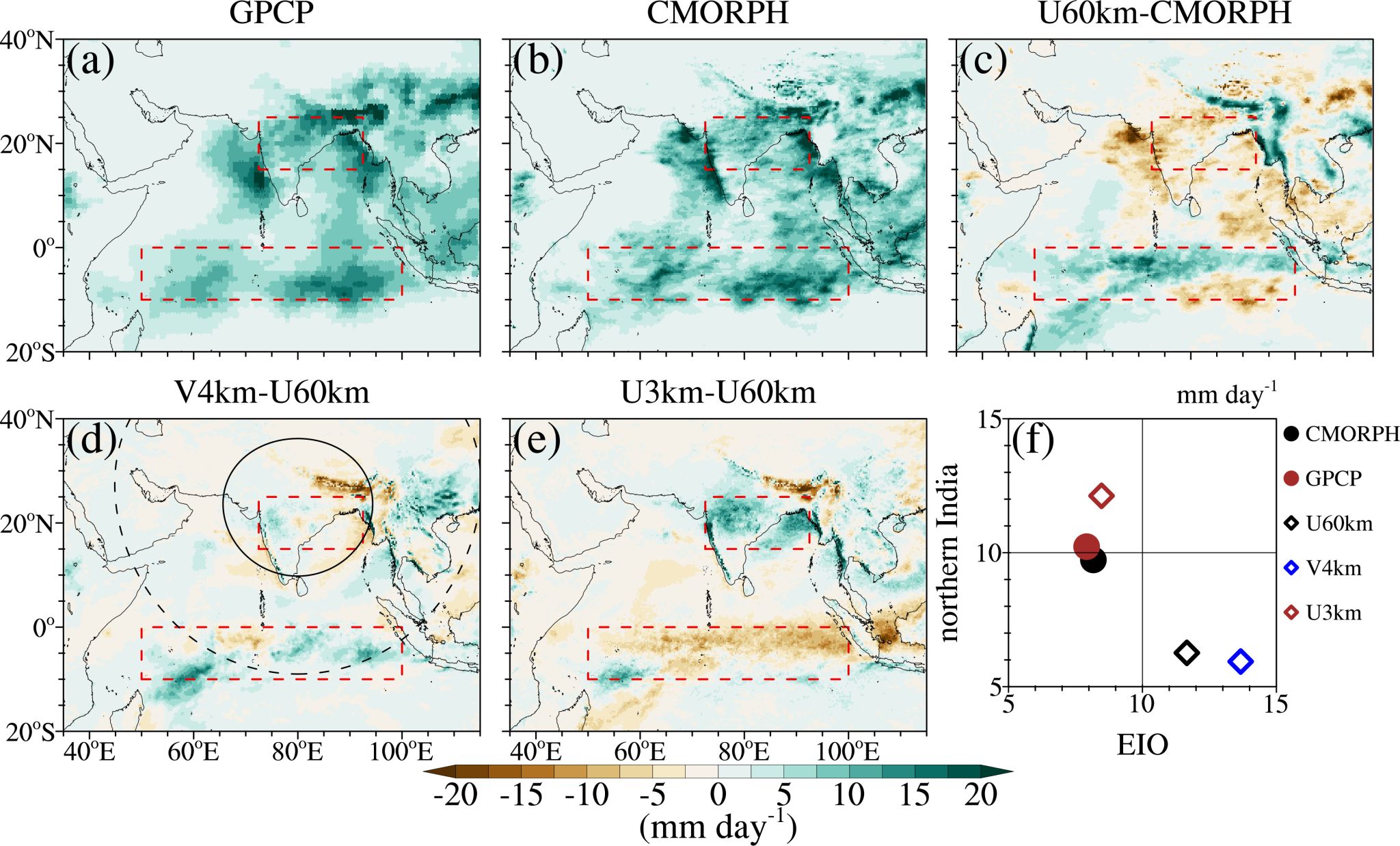 图1.2020年6月11日至7月10日期间南亚夏季风平均降水。(a) GPCP观测数据;(b) CMORPH数据;(c)全球粗分辨率模式(U60km)相对于CMORPH的降水偏差;(d)变分辨率模式(V4km)与粗分辨率模式的差异,其中黑色实线内为加密至4公里的区域;(e)全球对流解析模式(U3km)与粗分辨率模式的差异;(f)赤道印度洋(EIO)雨带和印度北部雨带(NI)的平均降水,其中雨带地理区域对应a-e中的红色虚线区域。