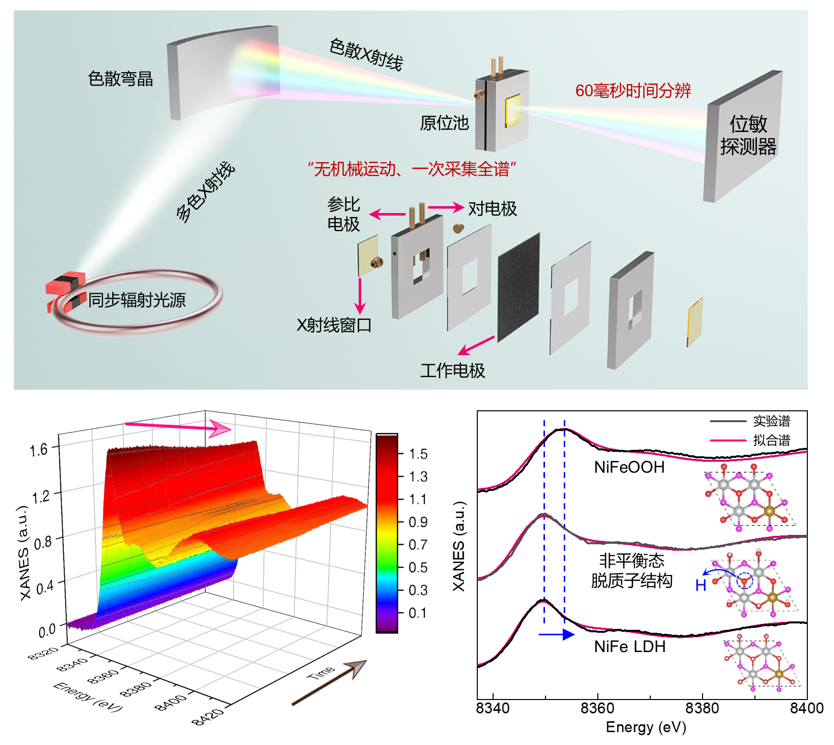 近日,中国科学技术大学国家同步辐射实验室与核科学技术学院姚涛教授团队,在捕捉电催化剂非平衡态结构的时间分辨同步辐射X射线谱学研究中取得了新进展。团队采用能量色散X射线吸收谱(ED-XAFS)技术,实现了毫秒级(60 ms)时间分辨全谱“单次采集”,极大地提升了数据采集的效率与精度。结合无监督机器学习算法,从数万张谱图中快速识别并筛选出催化剂重构过程中涉及的关键主成分相。通过对这些主成分随时间的动态变化进行定量解析,精确捕捉到非平衡态中间体的特征结构信息及其动态形成规律(图1)。相关研究成果以“Time-resolved spectroscopy uncovers deprotonation-induced reconstruction in oxygen-evolution NiFe-based (oxy)hydroxides”为题,发表于国际学术期刊《自然?通讯》。