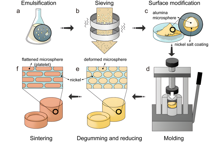 图1.仿珍珠母陶瓷—金属复合材料的制备流程示意图。分别依次经过乳化、过筛、表面修饰和热压烧结步骤,最终制备成型。